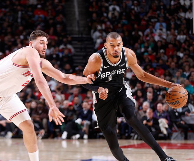 火箭主场迎战马刺,火箭少了范弗利特、亚当斯,马刺主力俱在,火箭长时间压制马刺,一度领先16分,三节战罢领先2分,第四节文班暴走,单节得到13分9板3帽,带领马刺单节赢了14分完成逆转,最终马刺111-99击败火箭。文班15中8得到28分16板3助2断5帽,福克斯11中6得到18分5板8助,哈珀11中8得到16分4板3助,火箭方面杜兰特17中8得到24分2板6助,阿门23中11得到25分7板4助4断,申京20中7得到18分10板7助2断。