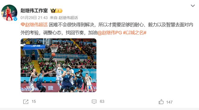 赛后,赵继伟工作室发文喊话辽宁全队:困难不会很快得到解决,所以才需要足够的耐心、毅力以及智慧去面对内外的考验,调整心态,找回节奏,加油。本场比赛,赵继伟状态低迷,仅得到8分4板6助,正负值-18全队最低。