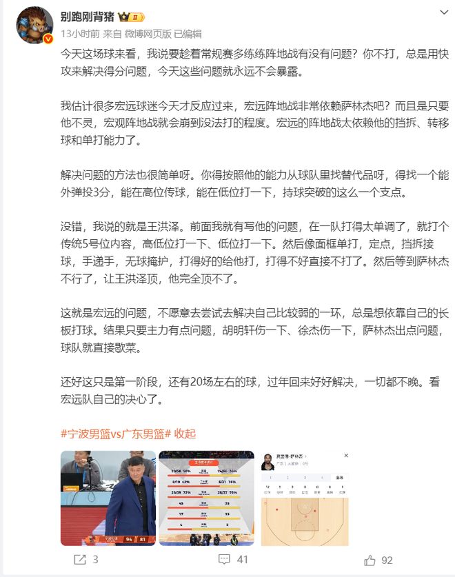 但别跑刚背猪却认为广东的症结在阵地战,一味的打快实际上是暴露软肋,广东进攻端太依赖萨林杰,一旦他这个点被限制广东阵地进攻就打不开,萨林杰的挡拆、转移、单打全靠萨林杰。