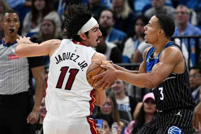 末节比赛,贝恩两记三分与一次2+1连续得分,一人打出9-2攻势扩大13分优势打停热火。哈克斯中投得分,席尔瓦三分命中扩大14分优势,热火一波6-2攻势追分,魔术内外开花维持107-95领先优势。维金斯三分命中,卡特与米切尔接连上篮得分,贝恩两罚全中,双方接连得分还剩2分钟继续维持11分优势。阿德巴约抛射与大帽布莱克,维金斯上篮追到差7分,萨格斯被犯规两罚全中,热火无力回天,最终魔术逆转战胜热火。