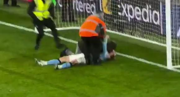 北京时间2月9日英超第25轮,曼城2-1逆转击败利物浦。本场比赛最后时刻曼城曾打进第三个进球,但这粒进球随后被判无效。在这粒进球发生后,与索博斯洛伊发生肢体接触后倒地的哈兰德顺势躺在球门附近,此时一名球迷冲入球场拥抱哈兰德,随后被安保人员拉走。