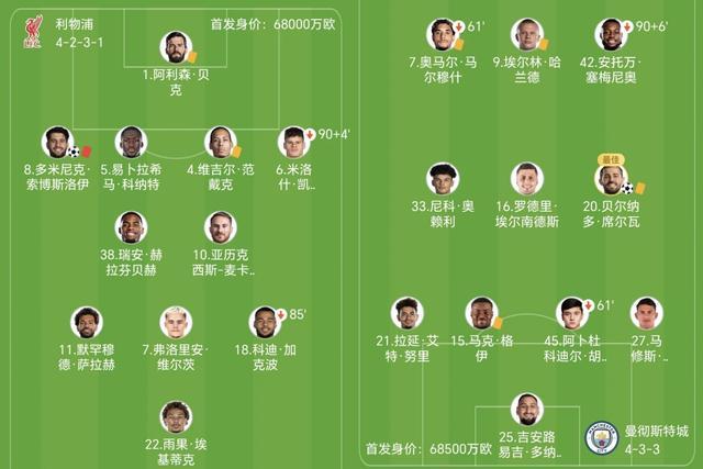相比之下,瓜迪奥率领的曼城依旧处于争冠行列,总进球数高居联赛第一。双方此战尽遣主力,埃基蒂克、萨拉赫、维尔茨、加克波,马尔穆什、哈兰德、塞梅尼奥各自领衔两队进攻群。