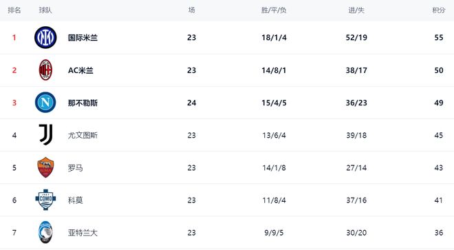 在积分榜上,国际米兰依然高居榜首,18胜1平4负拿到55分。AC米兰紧随其后,拿到50分,落后5分。那不勒斯以49分排名第3。那不勒斯比前两名的球队多踢1场。尤文图斯以45分排名第4。罗马拿到43分,排名第5。科莫以41分排名第6。亚特兰大只拿到36分,排名第7。第8的是拉齐奥,只有32分。
