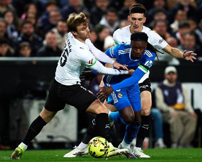 在两支球队赛季首回合交锋时,皇马在伯纳乌4-0血洗了瓦伦西亚,如今再度相遇,为了延续强势的发挥,皇马在梅斯塔利亚球场也是尽遣主力出战,在442的阵型中,让库尔图瓦镇守龙门,大卫希门尼斯、劳尔阿森西奥、赫伊森和卡雷拉斯构筑后防,居莱尔、巴尔韦德、琼阿梅尼和卡马文加坐镇中场,双箭头则是姆巴佩搭档贡萨洛加西亚。