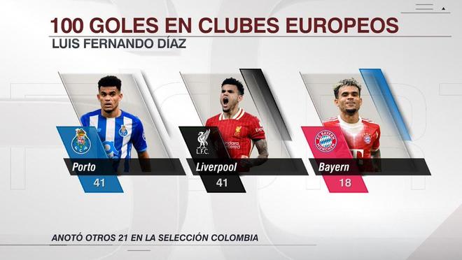 德甲第21轮,拜仁慕尼黑主场5-1大胜霍芬海姆,路易斯-迪亚斯上演帽子戏法,至此,这位哥伦比亚边锋自登陆欧洲足坛以来已打入100球。