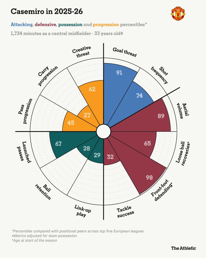 人们对卡塞米罗的未来产生了疑问,尤其是他的体能下滑后。而且,曼联主帅的战术安排,没有给卡塞米罗帮助,尤其是鲁本·阿莫林的343阵型,中场中路只有两人,搭档还是布鲁诺·费尔南德斯,卡塞米罗需要覆盖太大区域,防守时经常颇为狼狈。毕竟,胖虎下个月就34岁了。