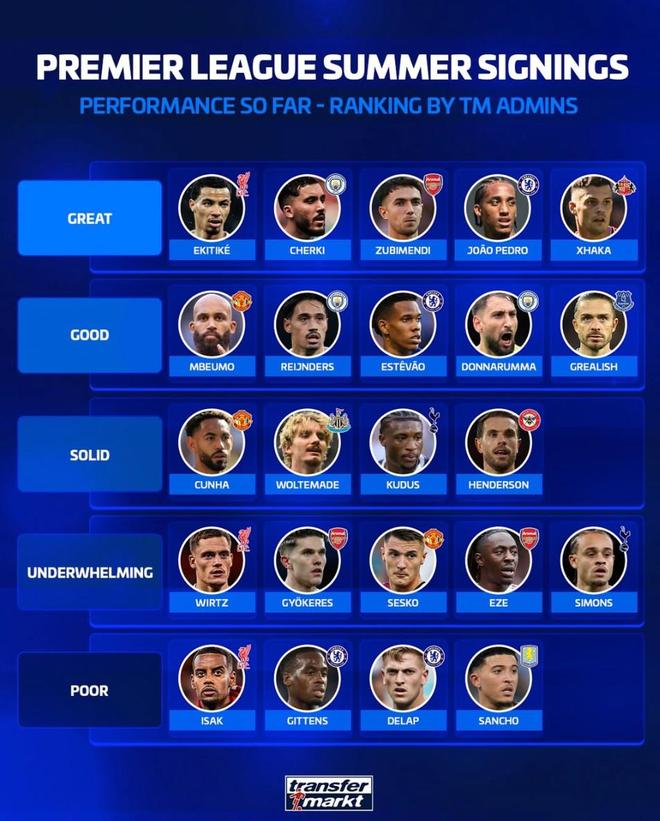 北京时间2月23日,德转对英超俱乐部去年夏天的重要引援进行了从夯到拉的评级,埃基蒂克、谢尔基、苏比门迪以及若昂-佩德罗获得最高评价,伊萨克、比诺埃-吉滕斯、德拉普以及桑乔则被评为最差。