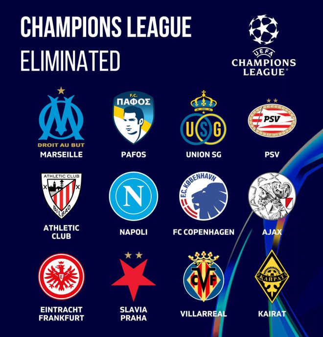 在这出局的12支球队中,有5支来自五大联赛,分别是2支来自西甲(毕尔巴鄂竞技、比利亚雷亚尔)、1支来自德甲(法兰克福)、1支来自意甲(那不勒斯)、1支来自法甲(马赛)。