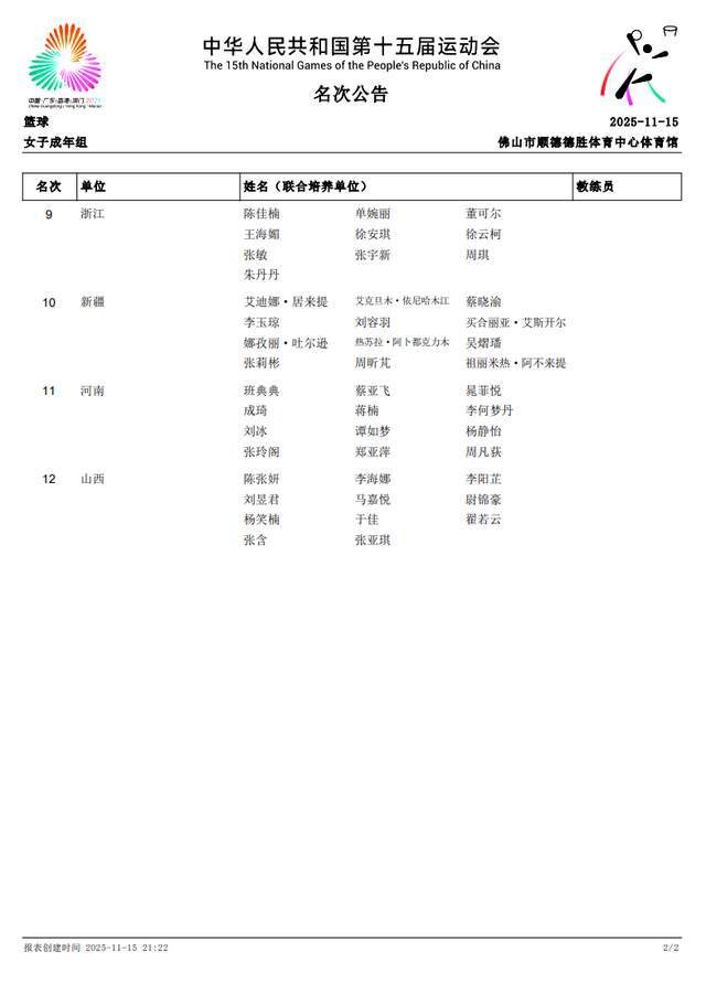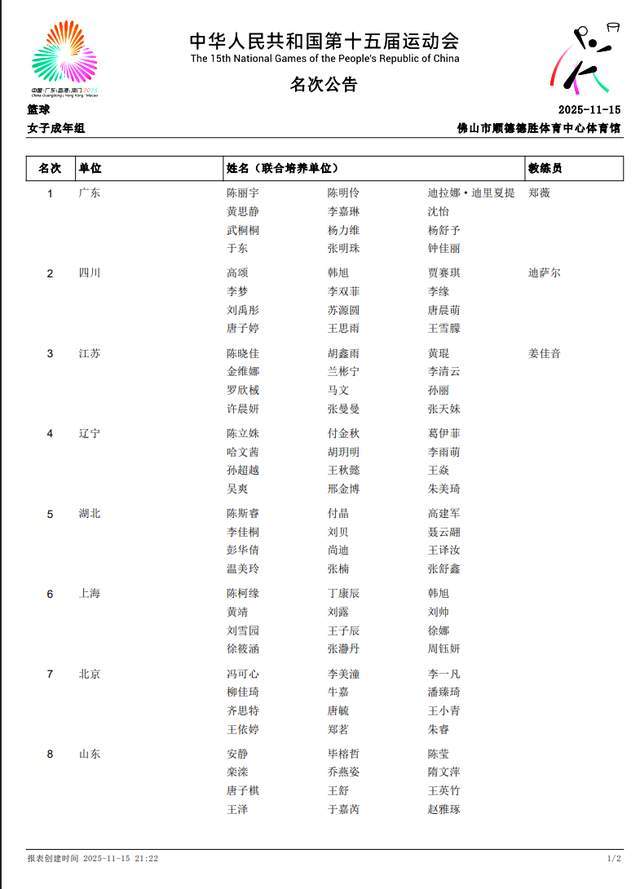 至此,全运会女篮成年组落幕,最终名次也出炉了,广东第一,四川第二,江苏第三,辽宁第4,湖北第5,上海第6,北京第7,山东第8,浙江第9,新疆第10,河南第11,山西第12。