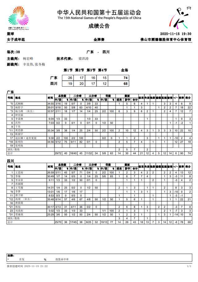 四川队俨然已经被逼上绝路,迪萨尔一次又一次暂停做出调整,效果并不理想。尽管四川队把分差迫近到个位数,却依旧难以翻盘。最终,广东女篮以74-68击败四川队,成功拿下全运会女篮项目的金牌,四川队屈居亚军。