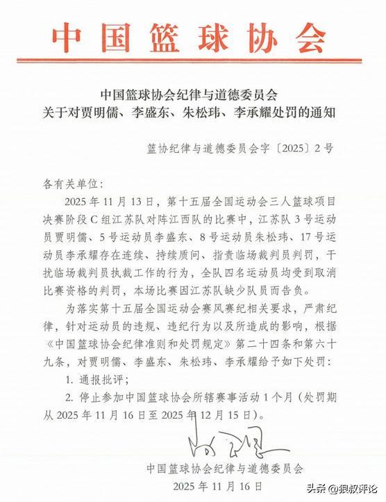 2025年11月13日,第十五届全国运动会三人篮球项目决赛阶段C组江苏队对阵江西队的比赛中,江苏队3号运动员贾明儒、5号运动员李盛东、8号运动员朱松玮、17号运动员李承耀存在连续、持续质问、指责临场裁判员判罚,干扰临场裁判员执裁工作的行为,全队四名运动员均受到取消比赛资格的判罚,本场比赛因江苏队缺少队员而告负。为落实第十五届全国运动会赛风赛纪相关要求,严肃纪律,针对运动员的违规、违纪行为以及所造成的影响,根据《中国篮球协会纪律准则和处罚规定》第二十四条和第六十九条,对贾明儒、李盛东、朱松玮、李承耀给予如下处罚: