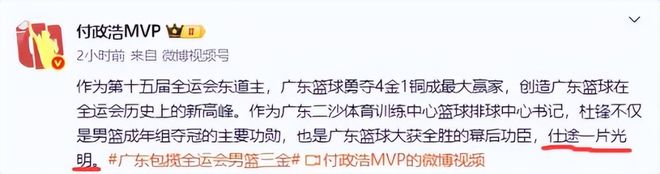 而知名媒体人付政浩也是大赞杜锋,用六字描绘了他的仕途,付政浩表示,作为第十五届全运会东道主,广东篮球勇夺4金1铜成最大赢家,创造广东篮球在全运会历史上的新高峰。作为广东二沙体育训练中心篮球排球中心书记,杜锋不仅是男篮成年组夺冠的主要功勋,也是广东篮球大获全胜的幕后功臣,仕途一片光明