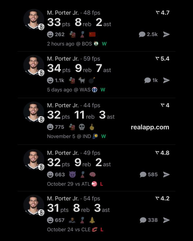这也是小波特近半个月来好状态的缩影,本场比赛拿下33分后,小波特已经连续5场比赛交出30+得分表现,在成为篮网这支鱼腩球队的头号得分手后,小波特用这样的表现强势完成自我证明。