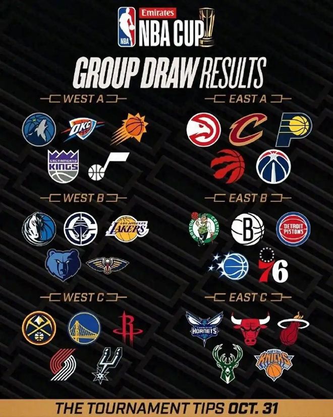 NBA杯的晋级规则是,西部3个小组的小组第1,和1个战绩最好的小组第2晋级半决赛。