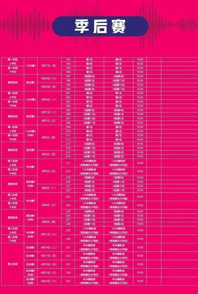 WCBA全明星赛将在3月21-22日进行,季后赛则是3月27日拉开帷幕,半决赛采取3场2胜制,总决赛采取5场3胜制,最晚在4月25日产生总冠军。