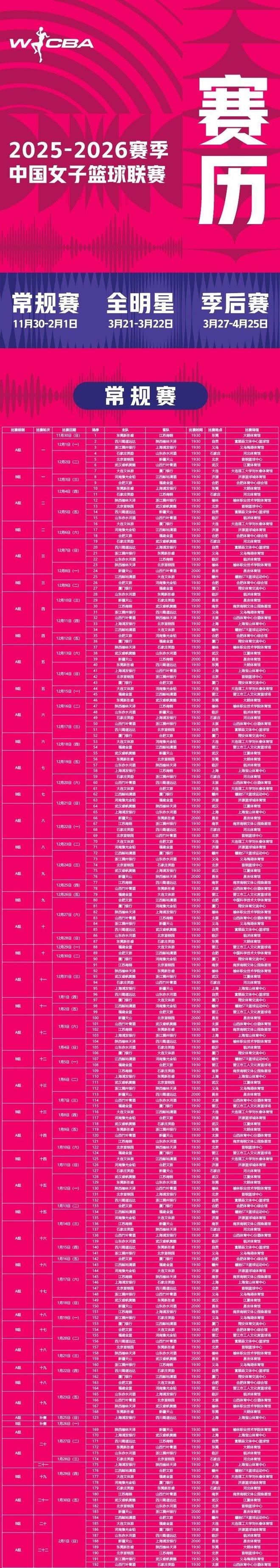 北京时间11月24日,WCBA官方公布2025-26赛季的全部赛程,常规赛从2025年11月30日到2026年2月1日,揭幕战是卫冕冠军广东女篮对阵江苏女篮的强强对话。全明星赛3月21日-22日,季后赛3月27日-4月25日,最晚4月25日产生总冠军。