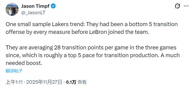 NBA记者杰森·蒂姆普夫在推特上解读了湖人进攻的变化:“一个小样本下的湖人趋势:湖人在勒布朗回归后,转换进攻表现显著提升。在他回归之前,湖人在转换进攻的任何统计中都几乎处于联盟倒数前五的位置。而在勒布朗加入后的三场比赛中,湖人平均每场通过转换进攻得到28分,这一数据接近联盟前五的水平。这无疑为球队带来了急需的助力。”