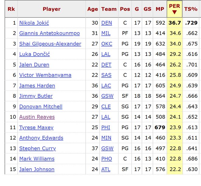 除了上述球员外,马克西、爱德华兹、库里、马威、杰伦约翰逊的PER值也不错,他们排名11-15,下面是上述球员的PER值。