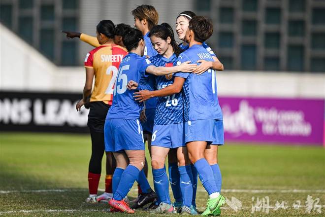11月20日,王霜进球后与队友庆祝。(湖北日报全媒记者任勇摄)