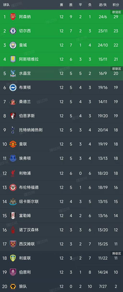 随着曼联0-1埃弗顿,英超第12轮结束了所有比赛,最新积分榜如下